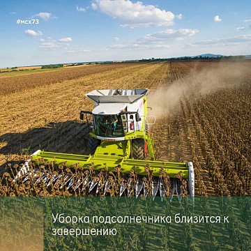 На сегодняшний день подсолнечник убран с площади 212 400 га, что составляет 84% от обшей площади. Средняя урожайность составляет 16 ц/га. В настоящее время собрано порядка 340 тысяч тонн масличной культуры.