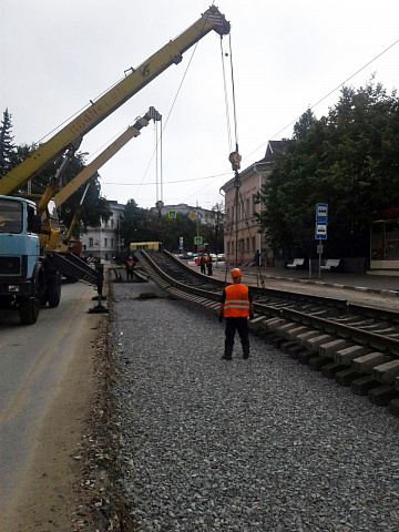 В настоящее время на улице Ленина – на участке между Гончарова и Спасской – уложены все 620 метров рельсошпальной решётки, которая наполовину засыпана щебнем.