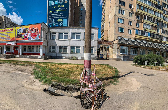 На Кирова, 20 прямо под опорой ЛЭП образовался провал, который чиновники не замечают уже неделю.
