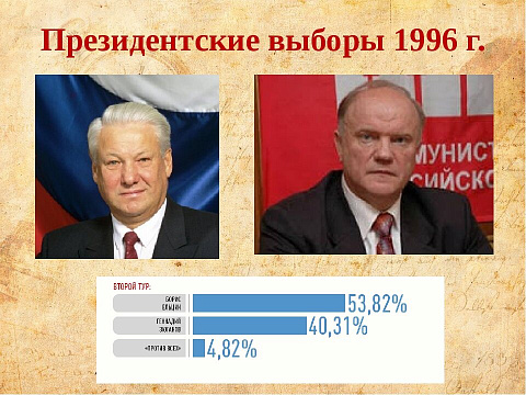 1996 год. Состоялись выборы президента России. Во втором туре победу одержал Б. Ельцин, во второй раз ставший Президентом РФ.