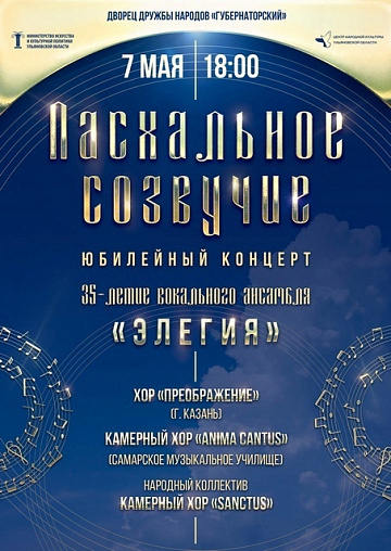 Юбилейный концерт «Пасхальное созвучие» будет организован 7 мая в 18.00 во Дворце дружбы народов «Губернаторский» (улица Дворцовая, 2/13) и станет частью VII Симбирского Губернского Пасхального фестиваля.