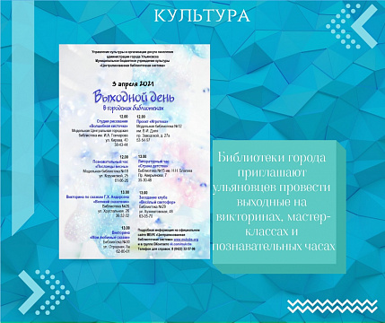По информации управления культуры и организации досуга населения администрации города Ульяновска библиотеки подготовили насыщенную программу выходного дня для своих посетителей.