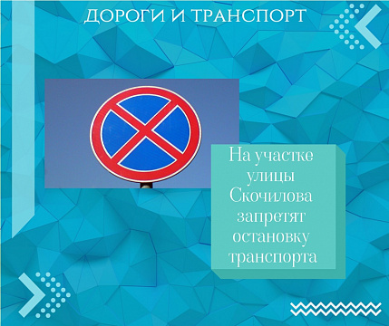 12 марта на улице Скочилова – от Жиркевича до Репина – установят дорожные знаки «Остановка запрещена», «Зона действия» и «Время действия».