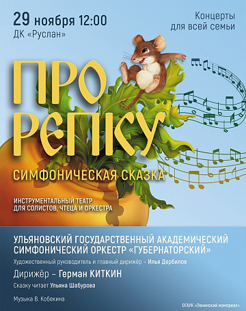 Музыканты Ленинского мемориала представят симфоническую сказку «Про Репку». Мероприятие состоится 29 ноября в 12.00 во Дворце культуры «Руслан» (ул. 40-летия Победы, 15). Своеобразный инструментальный театр для солистов, чтеца и оркестра представят Ульяновский симфонический оркестр под управлением дирижёра Германа Киткина и Ульяна Шабурова.