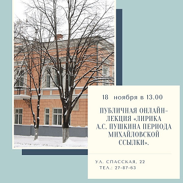 Тематическая публичная онлайн-лекция будет организована 18 ноября в 13.00 в Литературном музее «Дом Языковых» на базе представительства Государственного мемориального историко-литературного и природно-ландшафтного музея-заповедника А.С. Пушкина «Михайловское» (ул. Спасская, 22).