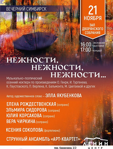 Музыкально – поэтический ноктюрн «Нежности, нежности, нежности» пройдёт в Ульяновске. Очередная программа проекта «Вечерний Симбирск» состоится 21 ноября в 17.00 в зале Дворянского собрания (пер. Карамзина, д. 3/2).