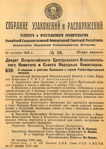 1917 год. День рождения советской милиции. Постановлением Народного комиссариата внутренних дел РСФСР была создана рабочая милиция. Сначала милиция находилась в ведении местных Советов, затем в структуре Наркомата внутренних дел, а с 1946 г. и по сей день – это структура министерства внутренних дел – сначала СССР, а затем Российской Федерации.