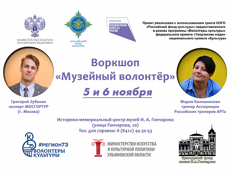 В 2020 году два проекта «Музейный волонтёр» и «Театральный волонтёр» получили грантовую поддержку Российского фонда культуры. Данные инициативы позволили познакомить молодёжь со спецификой отраслевых учреждений, обучить ребят азам добровольчества. Воркшоп – завершающий этап «Музейного волонтёра».  Он состоится 5 и 6 ноября в 14.00 в Историко-мемориальном центре - музее И.А. Гончарова (ул. Ленина, д. 138).