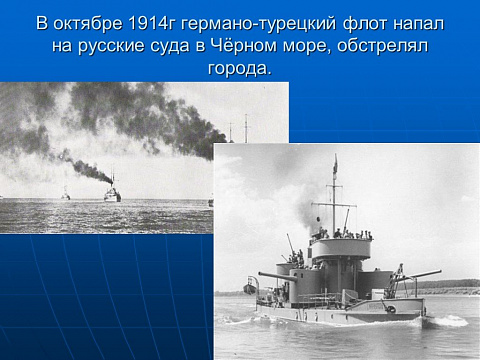 1914 год. Турецкий флот без объявления войны напал на русские суда в Черном море и бомбардировал Одессу, Феодосию, Севастополь и Новороссийск. Таким образом Турция, ранее провозгласившая нейтралитет, вступила в Первую мировую войну на стороне Германии, с которой 2 августа тайно подписала договор, по которому обязалась выступить в качестве ее союзника и фактически передать свою армию в распоряжение германского генерального штаба.